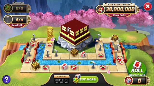 Path to Riches is a board game event within myKonami Slots. Players collect dice as they play (or with purchases). As players move around the board, they collect hammers and amulets to build a magical pagoda–complete the pagoda to receive a special Dragon Prize.
